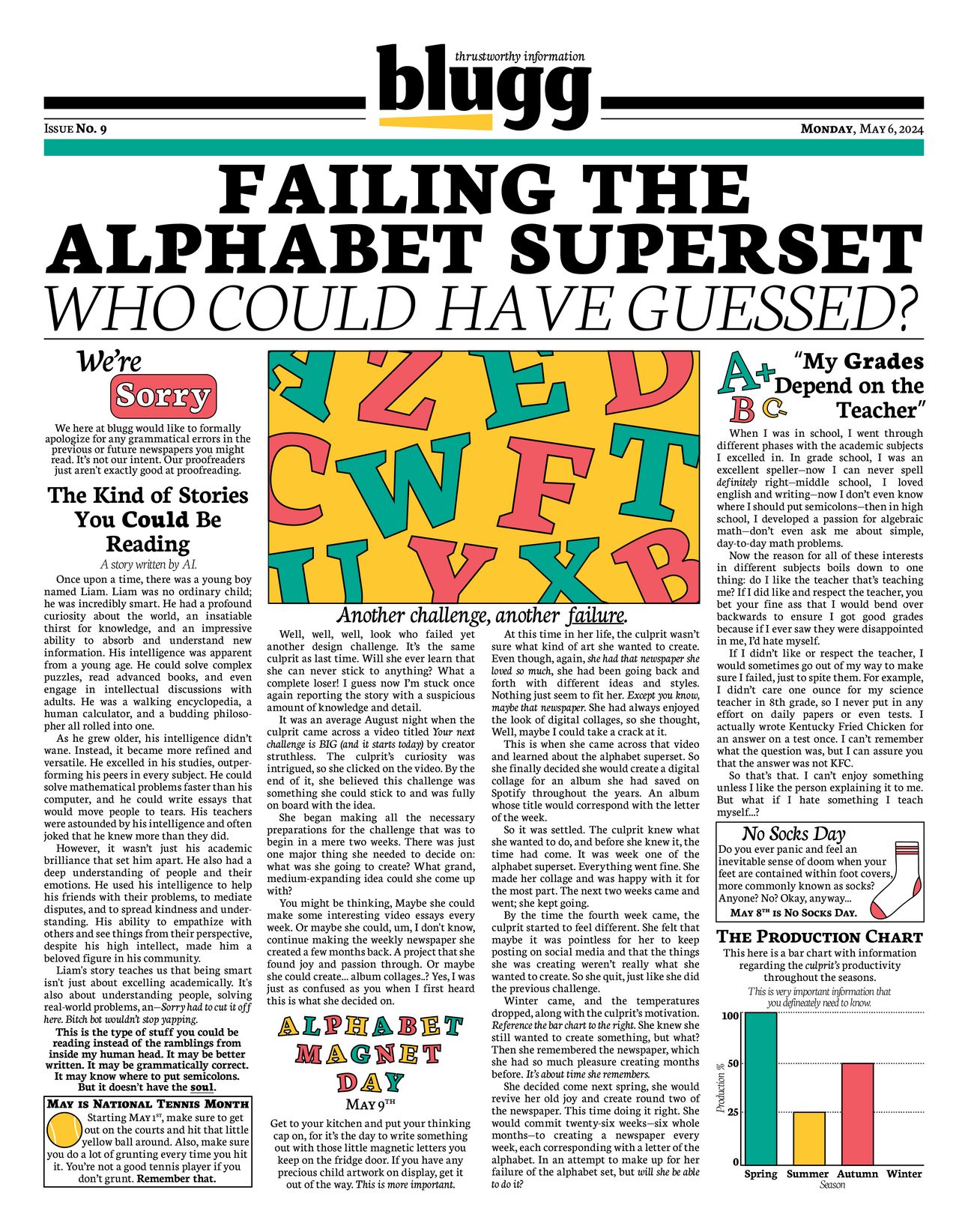 She decided come next spring, she would revive her old joy and create round two of the newspaper. This time doing it right. She would commit twenty-six weeks—six whole months—to creating a newspaper every week, each corresponding with a letter of the alphabet. In an attempt to make up for her failure of the alphabet set, but will she be able to do it?